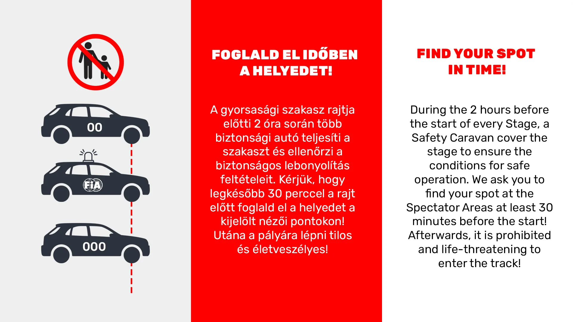 A gyorsasági szakasz rajtját megelőző 2 óra során több biztonsági autó teljesíti a szakaszt és ellenőrzi a szakasz biztonsági lebonyolításának feltételeit. Kérjük, hogy legkésőbb 30 perccel a rajt előtt foglald el a helyedet a kijelölt nézői pontokon! Tartsd be a sportbírók és a biztonsági személyzet utasításait és szükség esetén kérd a segítségüket!