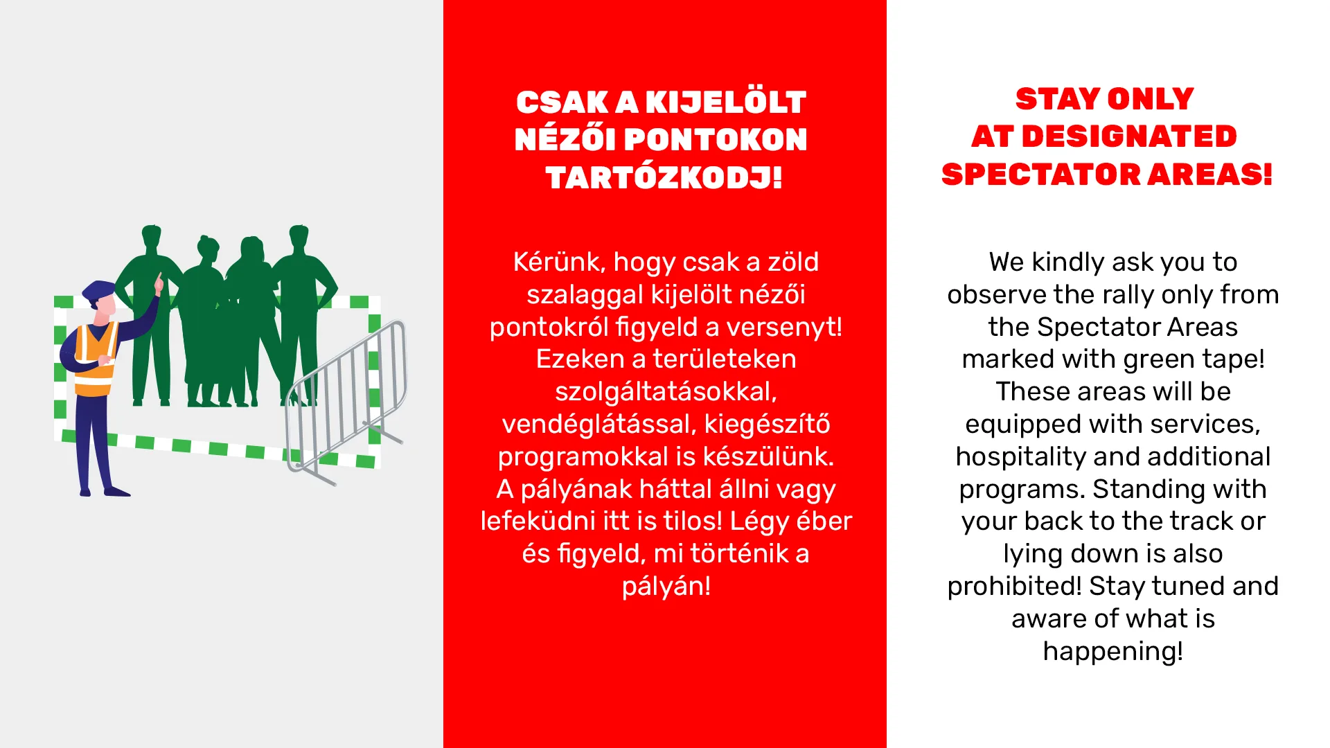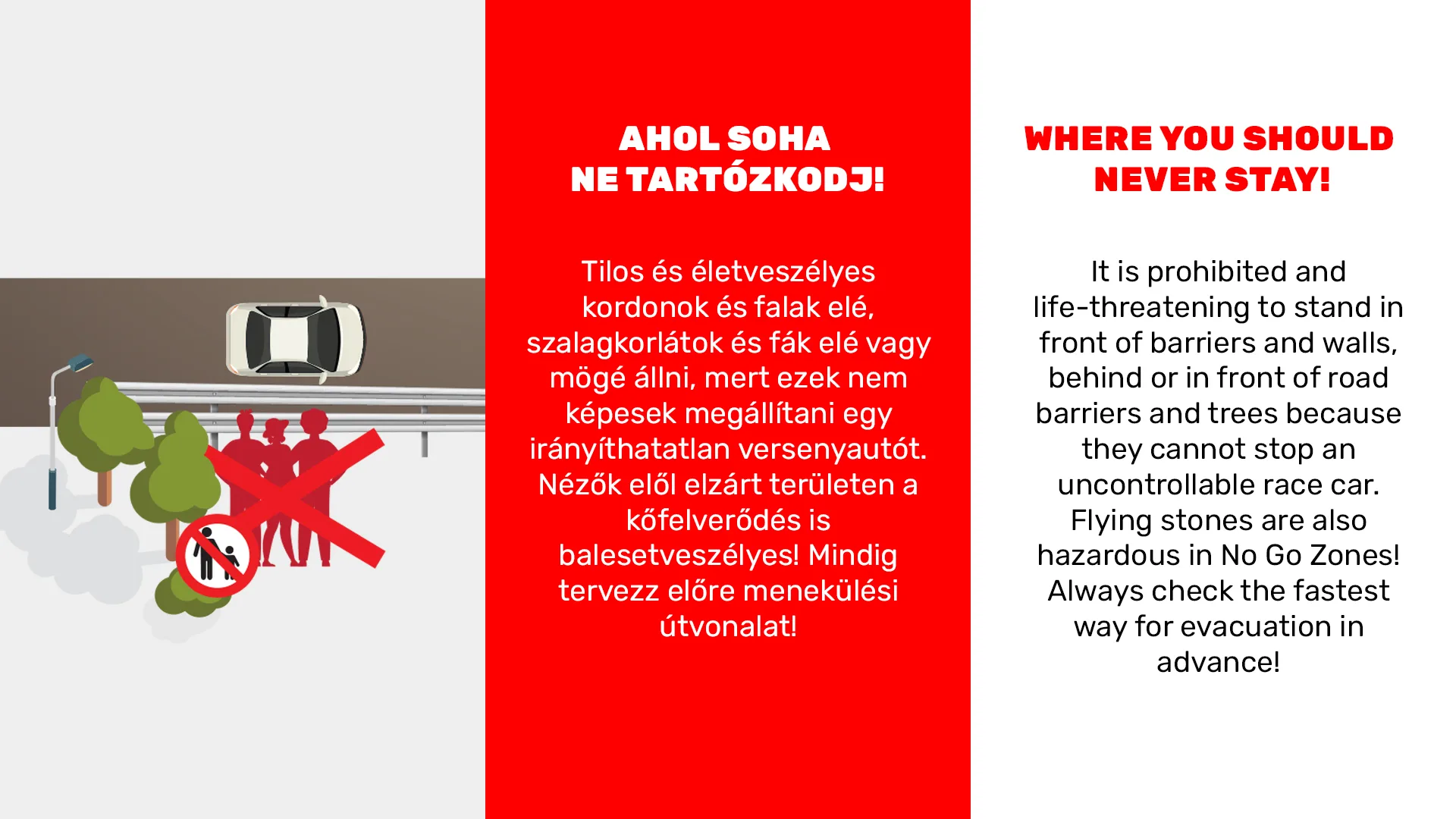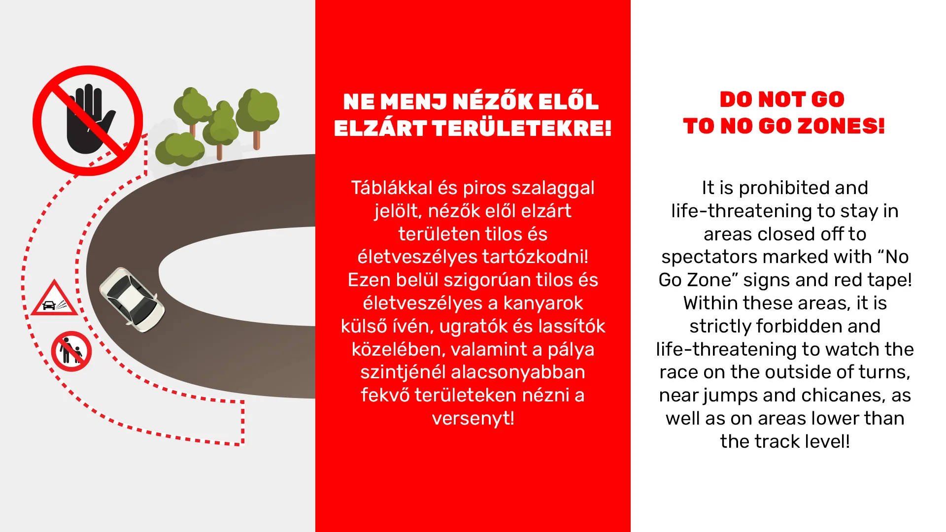 A motorsport veszélyeket rejthet – ezért van szükségünk a segítségedre. A versenyzőknek támadhat technikai gondjuk, vagy adódhat más ok, ami miatt képtelenek az autójukat az úton tartani. Emiatt kiemelten fontos, hogy te, mint szurkoló, hol állsz. Az alábbi grafikák megmutatják a veszélyes helyeket, ahol tilos tartózkodni.