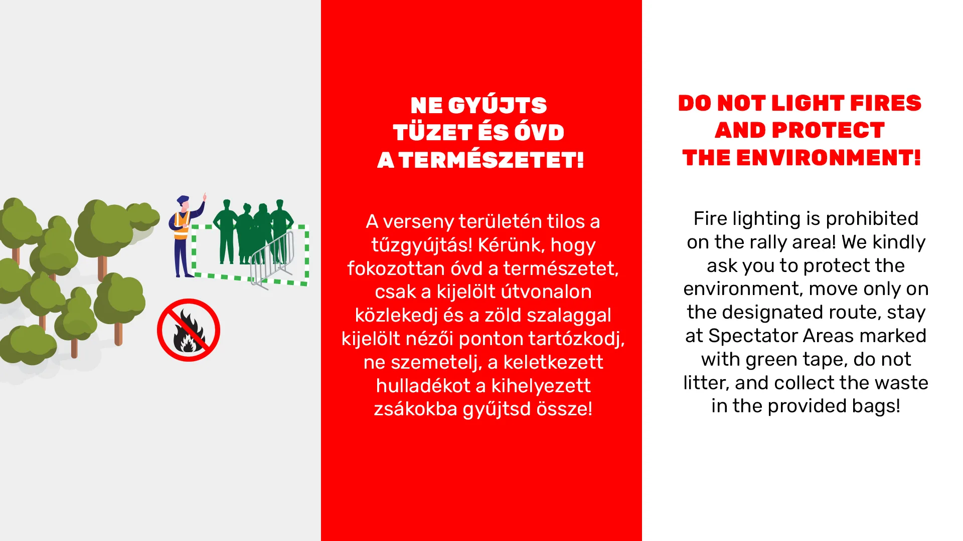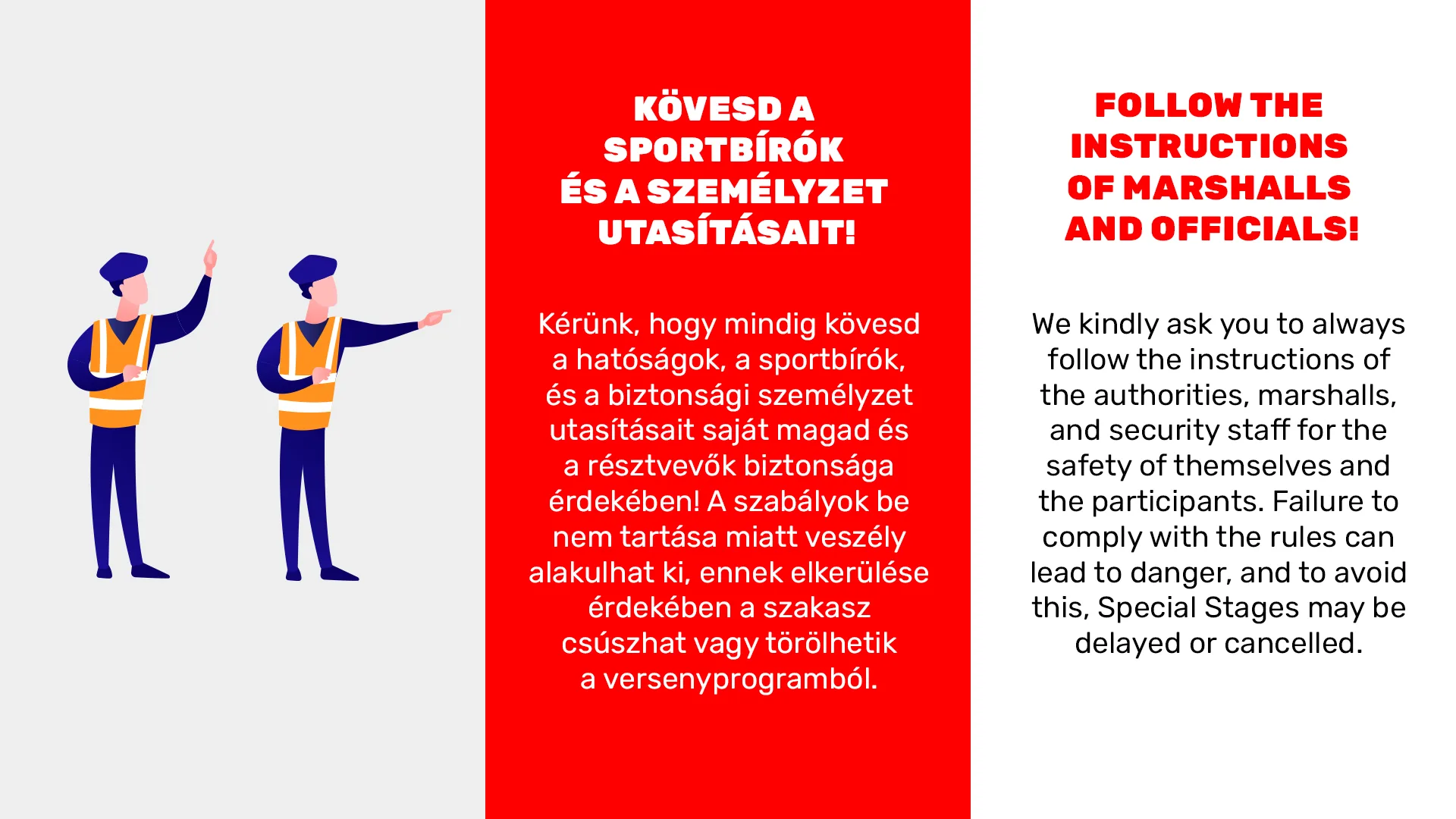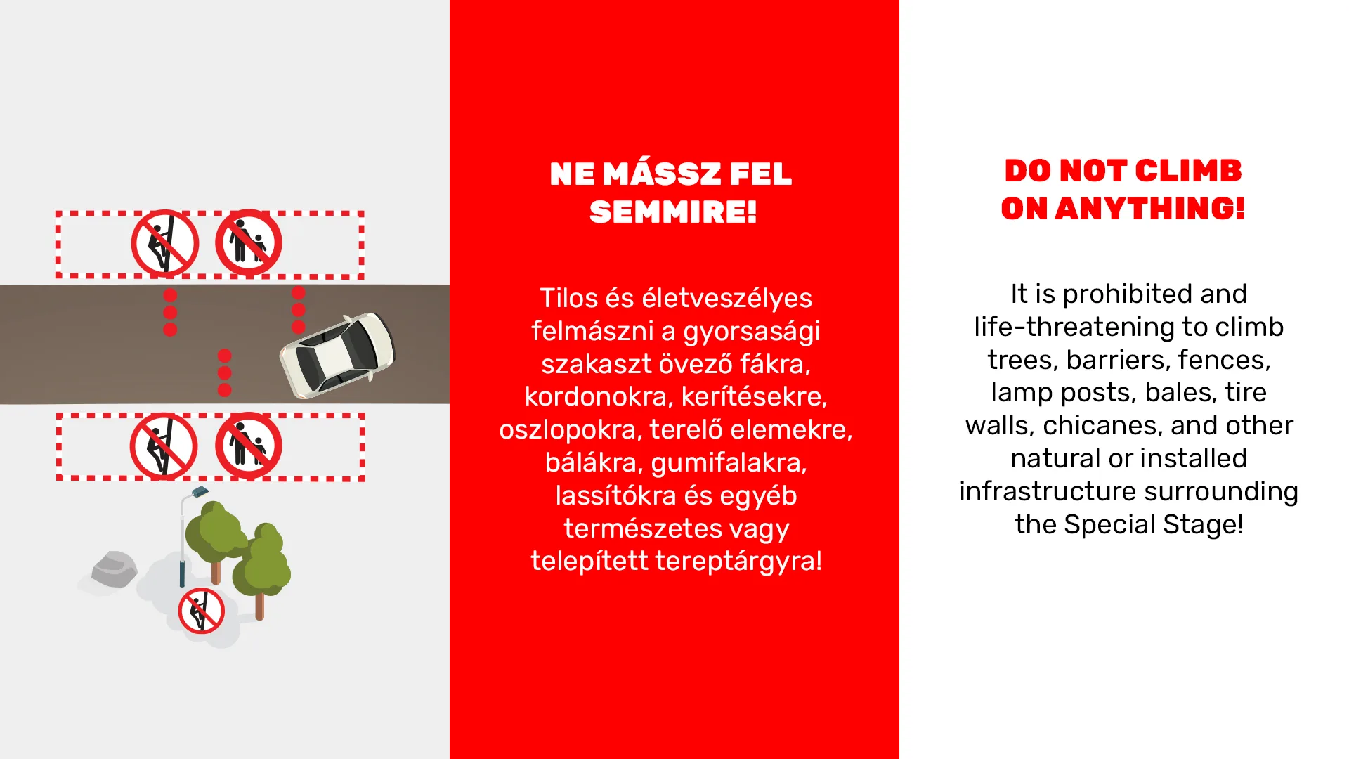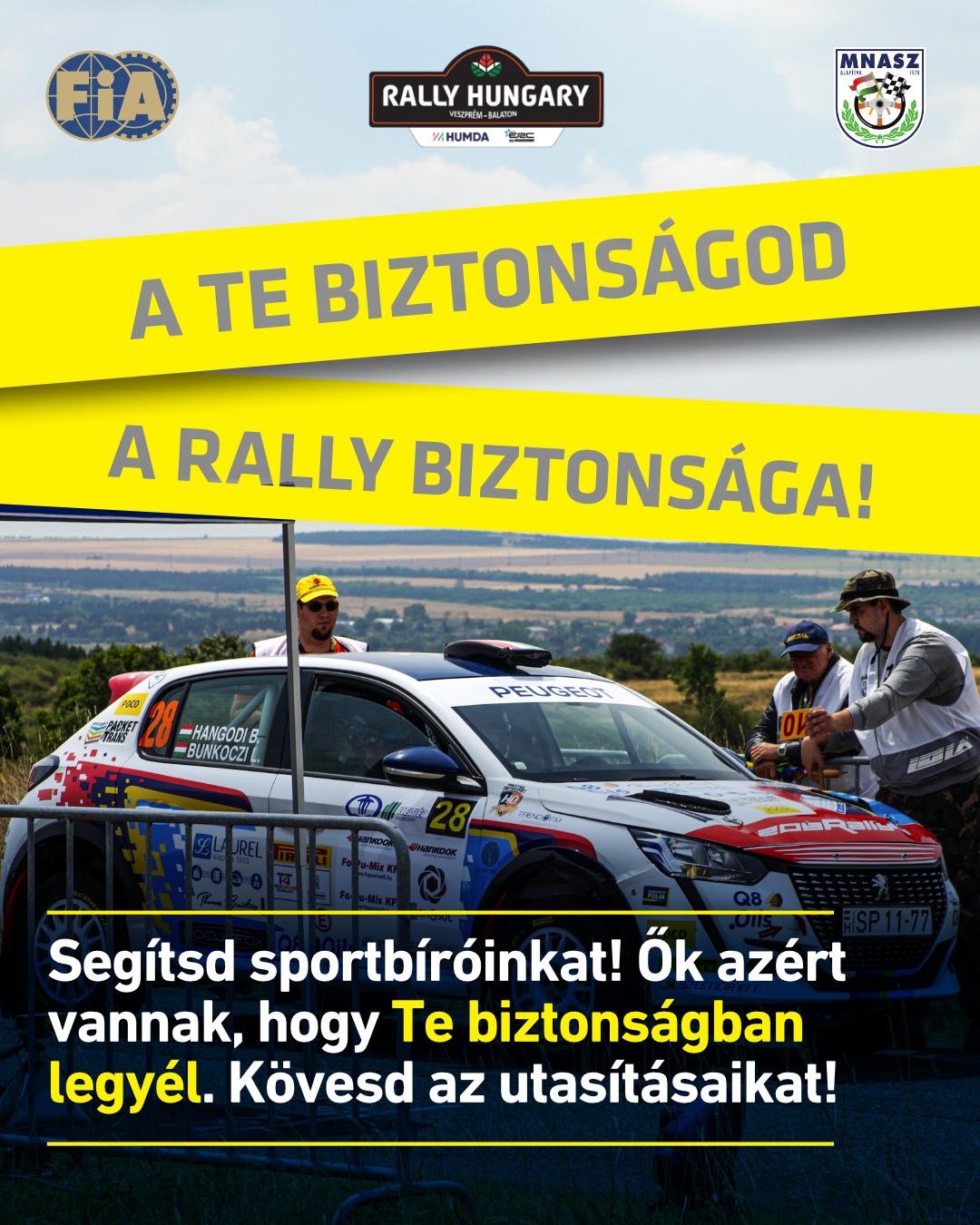Mindannyian azért vagyunk itt, hogy a lehető legközelebb kerüljünk az autókhoz, az akcióhoz és élvezzük a versenyt. Ám a rali szigorú határokon belül zajlik és nincs lehetőség a hibákra. Olvasd el a biztonsági információkat, kövesd a biztonsági személyzet és a sportbírók utasításait! Vigyázzatok egymásra és érezzétek jól magatokat!