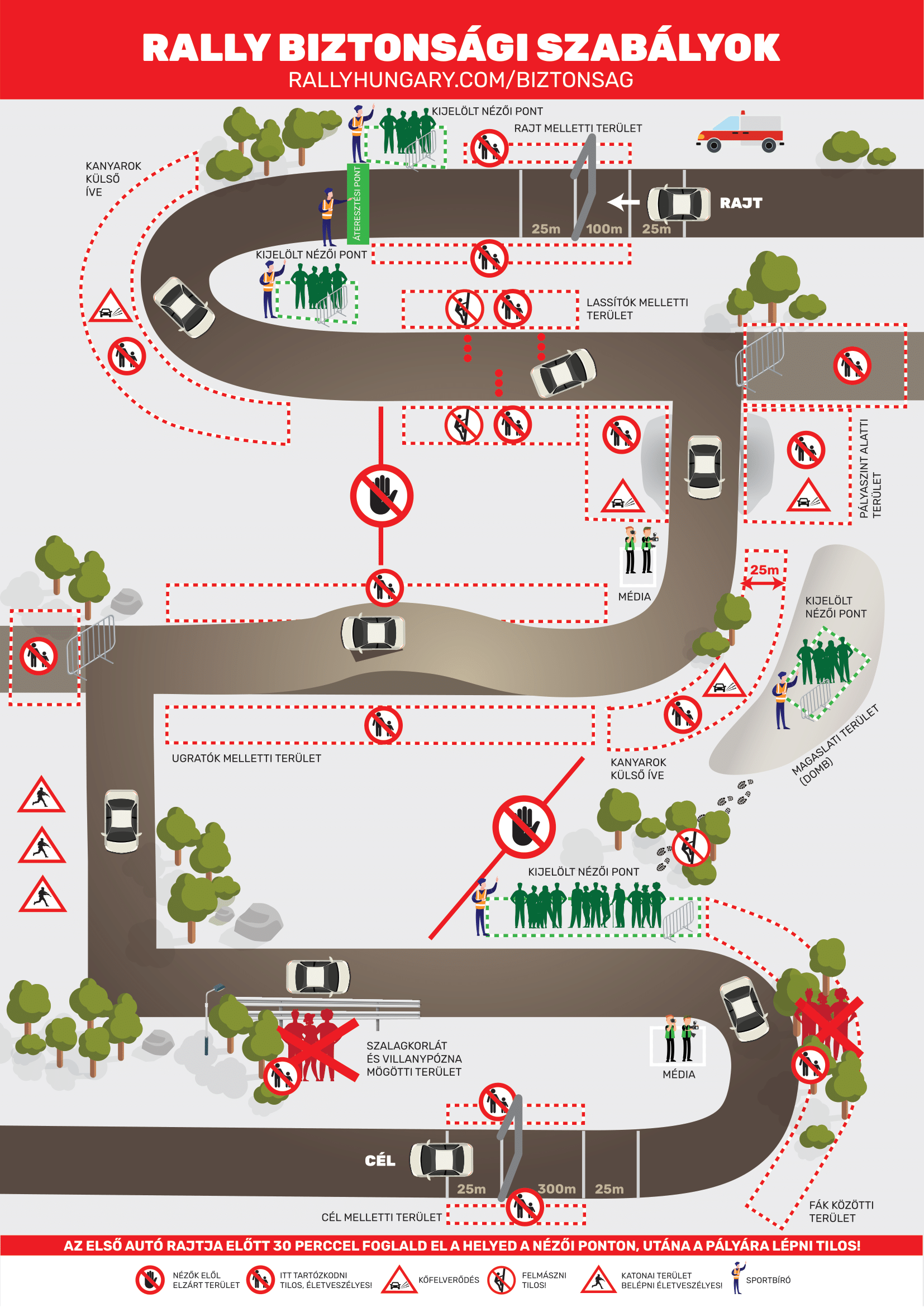 A motorsport veszélyeket rejthet – ezért van szükségünk a segítségedre. A versenyzőknek támadhat technikai gondjuk, vagy adódhat más ok, ami miatt képtelenek az autójukat az úton tartani. Emiatt kiemelten fontos, hogy te, mint szurkoló, hol állsz. Az alábbi grafikák megmutatják a veszélyes helyeket, ahol tilos tartózkodni.