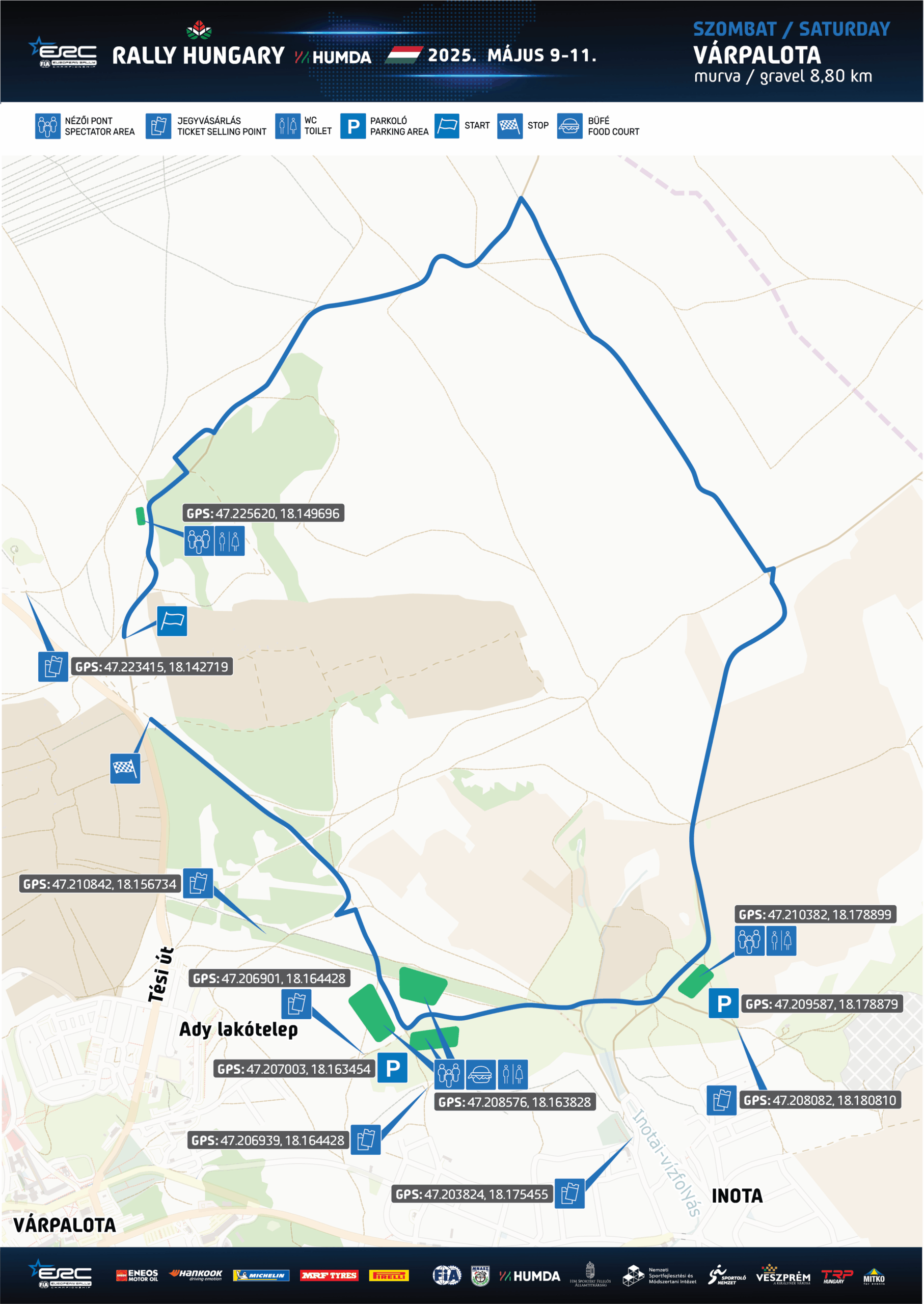 *A térképet letöltve, a koordinátára kattintva a GPS egyszerűen elnavigál a kiválasztott nézői vagy jegyértékesítési pontra és a parkolóba!